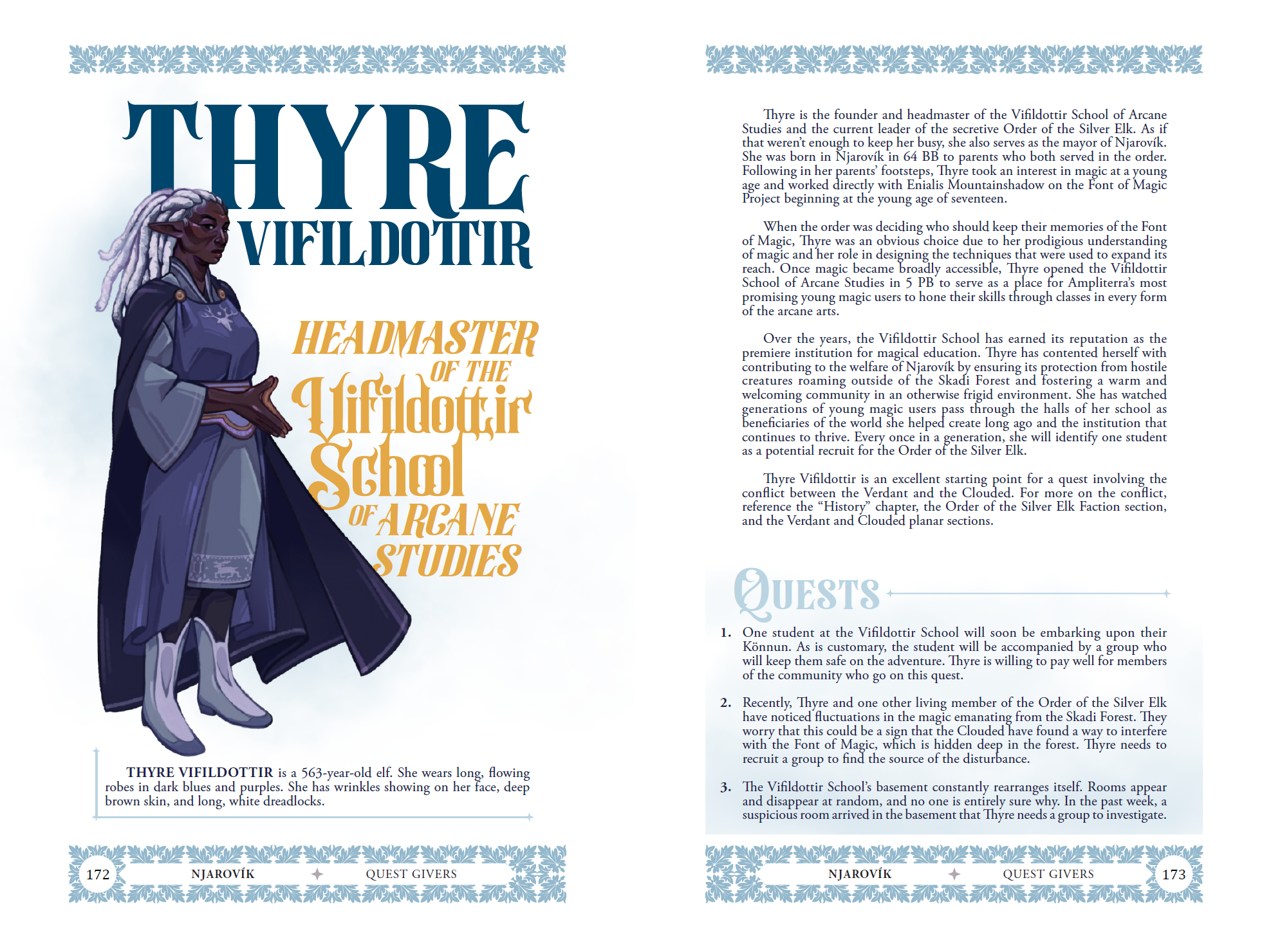 Having walked the world of Ampliterra for over five centuries, the weight of its history dwells in her wise, gentle gaze. Cloaked in midnight blues and deep purples, her long, white dreadlocks whisper of years spent unraveling the mysteries of magic itself. She founded the greatest arcane school in Ampliterra, governs the icy city of Njarovík as its mayor, and—if rumors are to be believed—pulls the strings of something far more secretive.