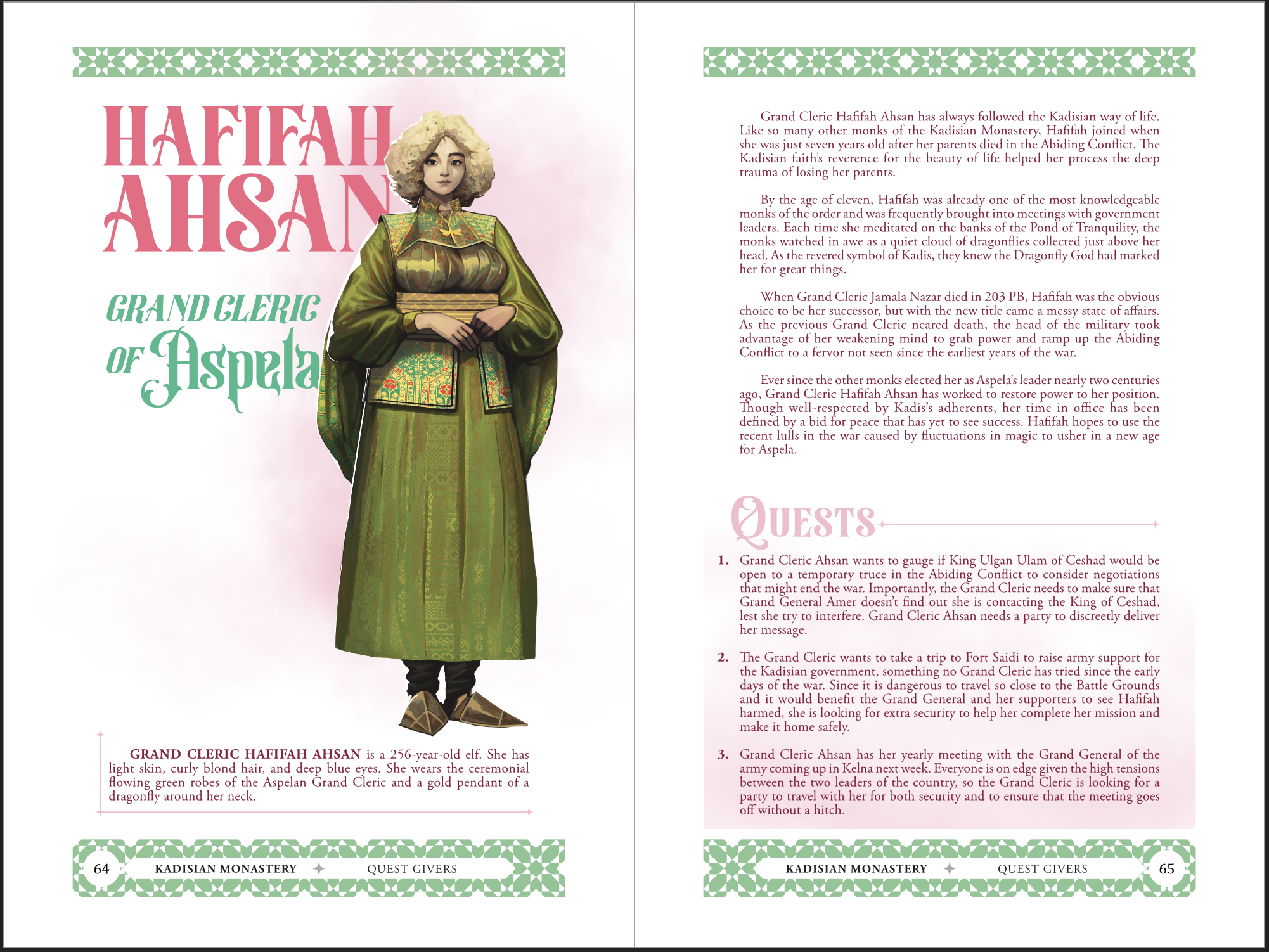 Here’s the draft layout spread for Hafifah Ahsan as of mid-July. You can see that there’s a block of white space between her biography and her quest threads.