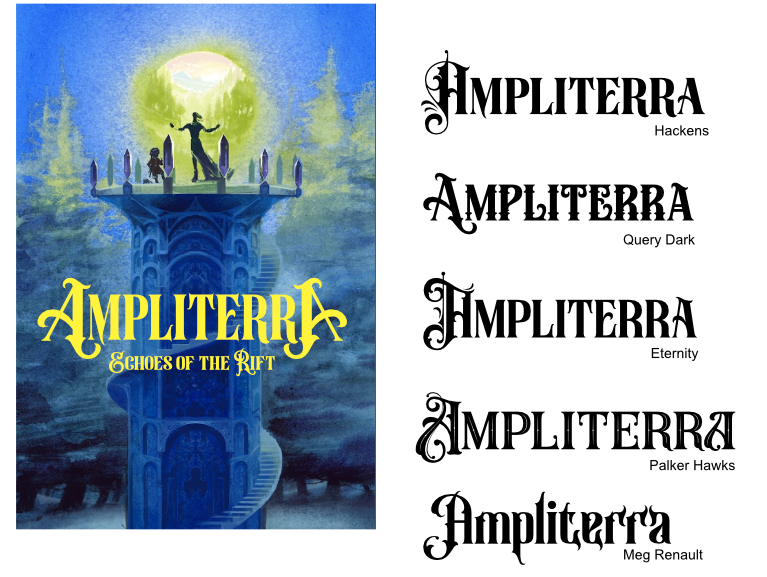 A few of the font options we experimented with over an early draft of the cover art. Art by Serena Malyon, Layout by Julie-Anne Muñoz.