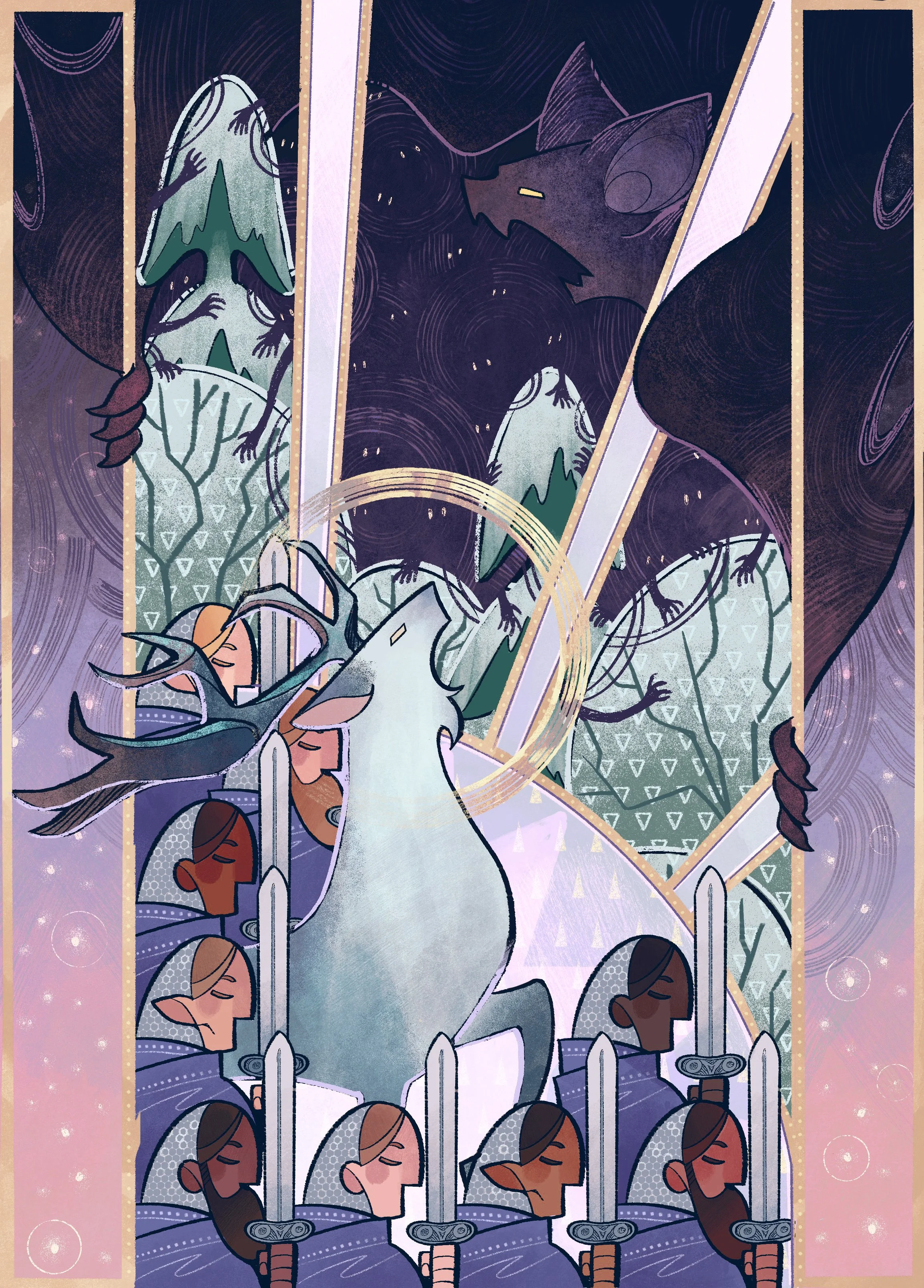 In the bottom right corner is another very important figure – the Silver Elk named Istus. The Silver Elk is a member of the Verdant Vættr, a group of extraplanar entities that arrived on Ampliterra to further their mission to spread planar equality through access to their plane’s endemic magic. The Silver Elk guided and advised their namesake order in the Font of Magic’s development. It’s only fitting that they be there in the final hours before its activation.